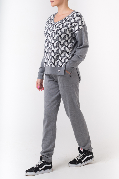 Брюки из шерсти мериноса умеренного объема с резинками по низу и кулиской по поясу. Имеются накладные карманы. Тренд - мягкость, теплота, уют, создаваемые трикотажем.