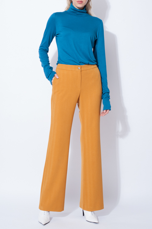 Брюки из жаккардовой "в елочку" однотонной мягкой поливискозы умеренного объема в верхней части и расклешенные к низу. В сочетании со свитшотом из этой же ткани - яркий лук.