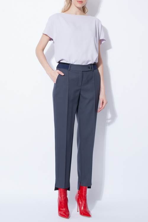 Брюки из костюмной п/шерсти умеренного объема, зауженные к низу. Спереди отстрочены стрелки. Низ брюк - ассиметричный, пояс частично выполнен из репсовой ленты. Карманы наклонные с отрезным бочком. Можно комплектовать жакетом из этой же ткани.