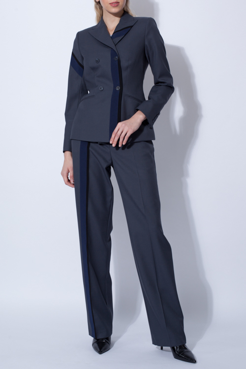 Брюки прямые из костюмной п/шерсти. Карманы наклонные с отрезным бочком. Спереди справа и сбоку слева - лампас из репсовой ленты. Рекомендуется комплектовать жакетом из этой же ткани.