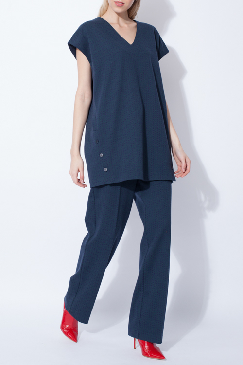 Брюки прямые из жаккардового трикотажа. За счет материала очень удобные и комфортные в носке. Карманы наклонные с отрезным бочком. Рекомендуется комплектовать жилетом из этой же ткани.
