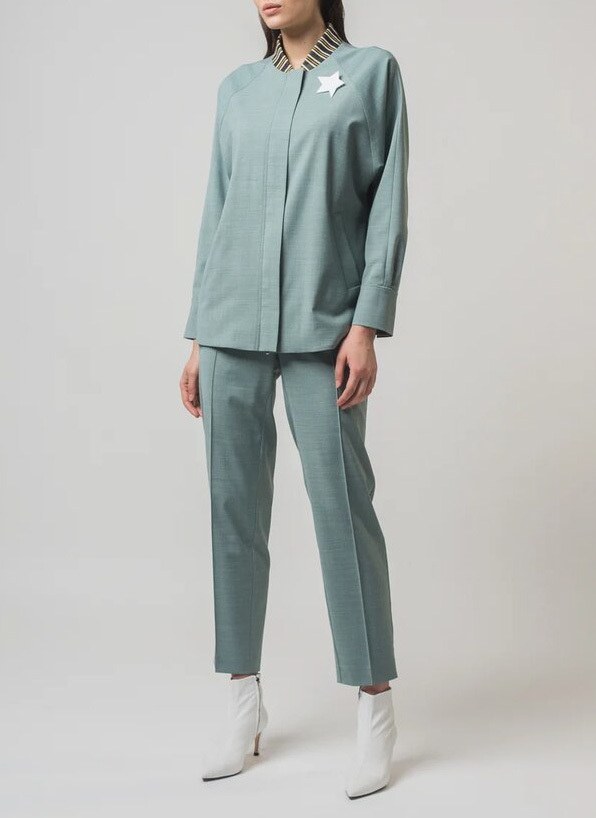Брюки из костюмной поливискозы стретч умеренного объема, зауженные к низу. Спереди отстрочены стрелки. Сзади пояс выполнен из полосатого трикотажа.