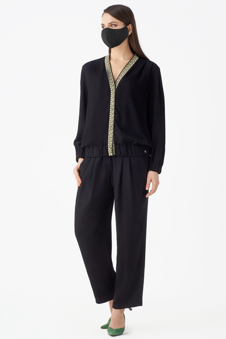 Брюки из тяжелой вискозы, достаточно объемные со складками по переду и кулиской на поясе со шнурком, позволяющей носить на любой тип фигуры. Брюки предлагаются с бомбером из этой же ткани.
