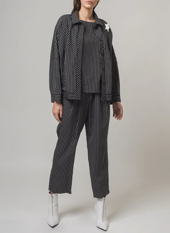 Бомбер из легкой струящейся вискозной ткани в полоску. Объемного силуэта с резинкой по низу, застежка - на кнопки, карманы-листочки. Комплект - с брюками из этой же ткани. Тренд - оптические иллюзии, полосы.