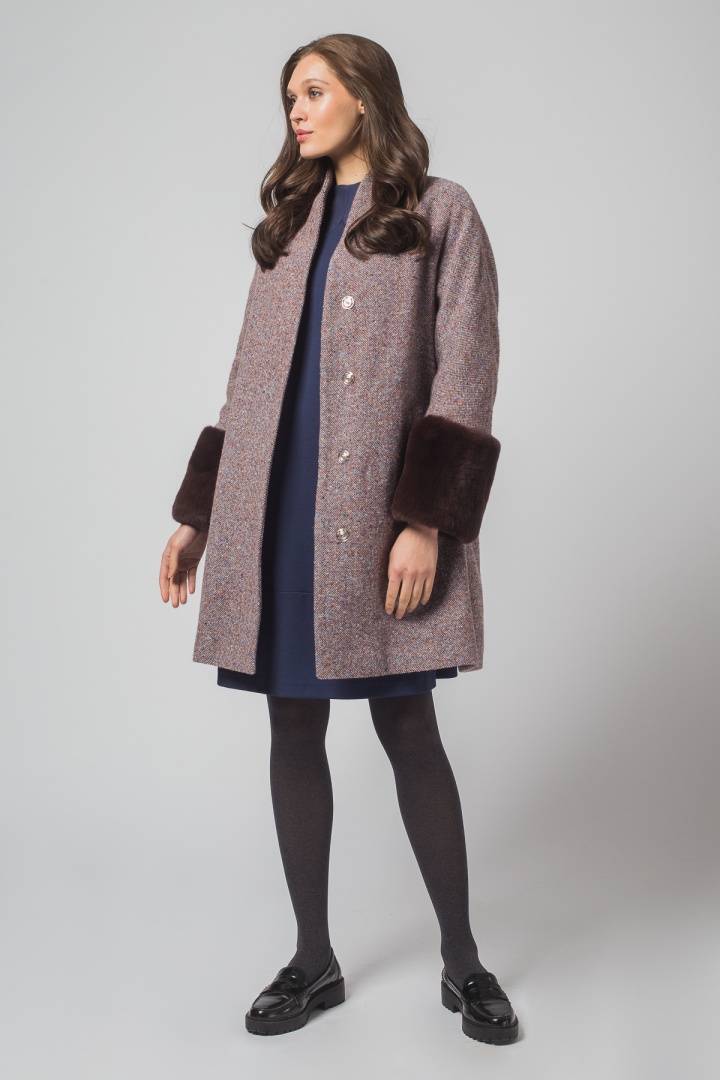 Пальто из шерстяной итальянской ткани - многоцветного твида. Силуэт - легкая трапеция, с поясом, с элегантным воротником стойкой, переходящей в шаль. Рукава с отделкой из меха - кролика рекс.