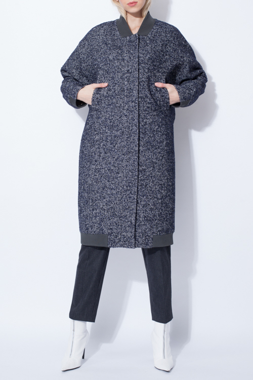 Пальто из п/шерстяного твида достаточно свободное, прямого силуэта, со спущенным плечом, с завышенными карманами. В моделе используются трикотажные подвязы, переводящие классику в «спорт-шик» - тренд сезона.