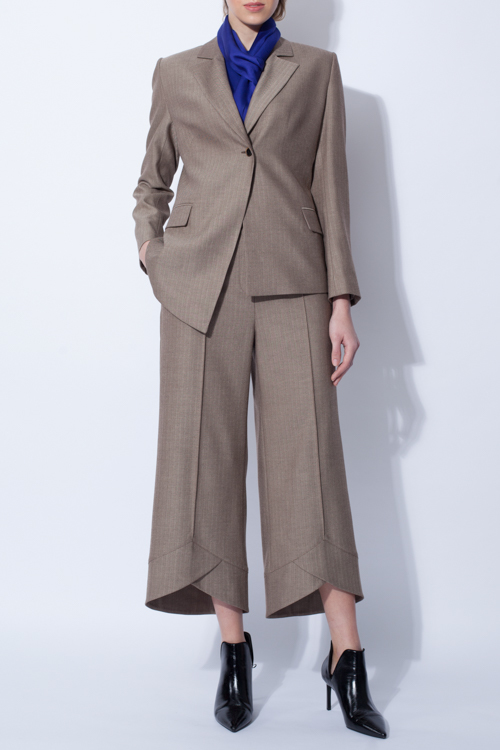 Жакет из костюмной поливискозной ткани со стретчем "елочка" п/прилегающего силуэта с ассиметричной полочкой. Карманы - прорезные с клапаном. Рекомендуется носить в комплекте с брюками и жилетом из этой же ткани. Тренд - ассиметрия в классическом костюме, элементы мужского костюма в женском.