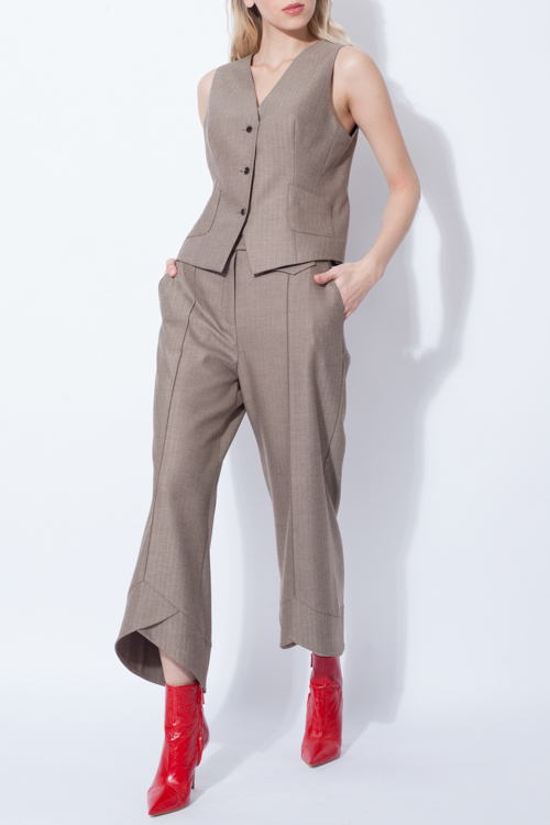 Жилет из костюмной поливискозной ткани со стретчем "елочка" приталенного силуэта. Карманы - накладные. Спинка выполнена из жаккардовой вискозной подкладки "белочки". Рекомендуется носить в комплекте с брюками и жакетом из этой же ткани. Тренд - ассиметрия в классическом костюме, элементы мужского костюма в женском.