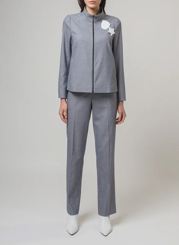Жакет из костюмной стретч ткани - мелкого жаккарда, с очень аккуратным верхом и с легкой трапецией к низу, подходит на любой тип фигур, смотрится аккуратно и элегантно. Комплект - с брюками прямого силуэта из этой же ткани.