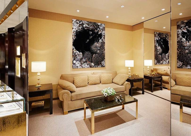 Интерьер пространства оформлен в традиционной палитре модного дома — черном, белом и золотом цветах. Кроме того, бутик украшают произведения искусства, созданные известными художниками: коллаж Питера Дейтона с цветами камелии, принт Шелтера Серра, литографии Агнес Мартин и картина Томаса Фужероля.