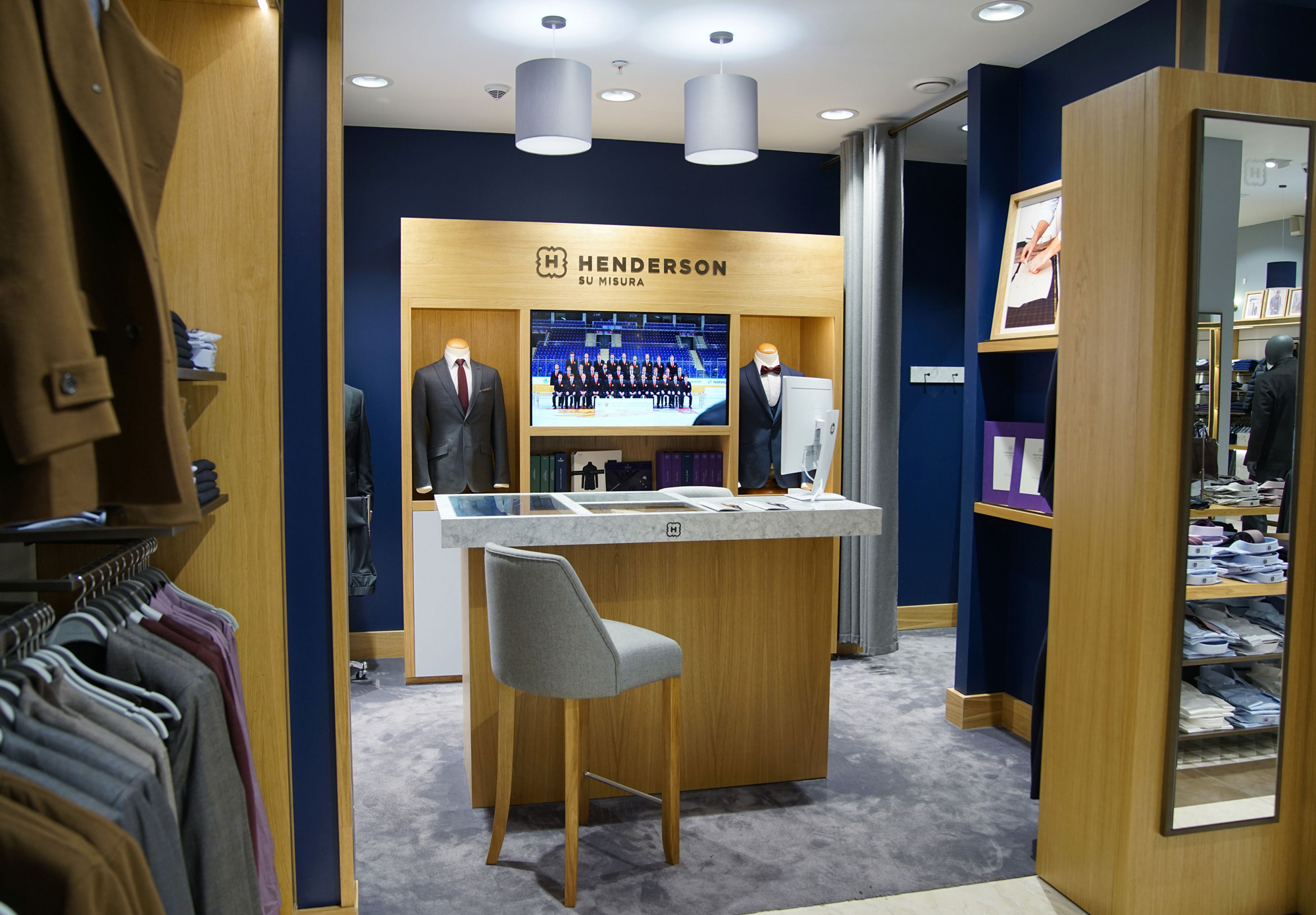 Торговая площадь моностора Henderson составляет около 300 квадратных метров. Дизайн интерьера разработан при участии британского архитектурного бюро. Пространство позволило вместить коллекцию классических, повседневных изделий, а также зону индивидуального пошива Henderson Su Misura, где представлено более 10 000 тканей ведущих итальянских и британских фабрик.