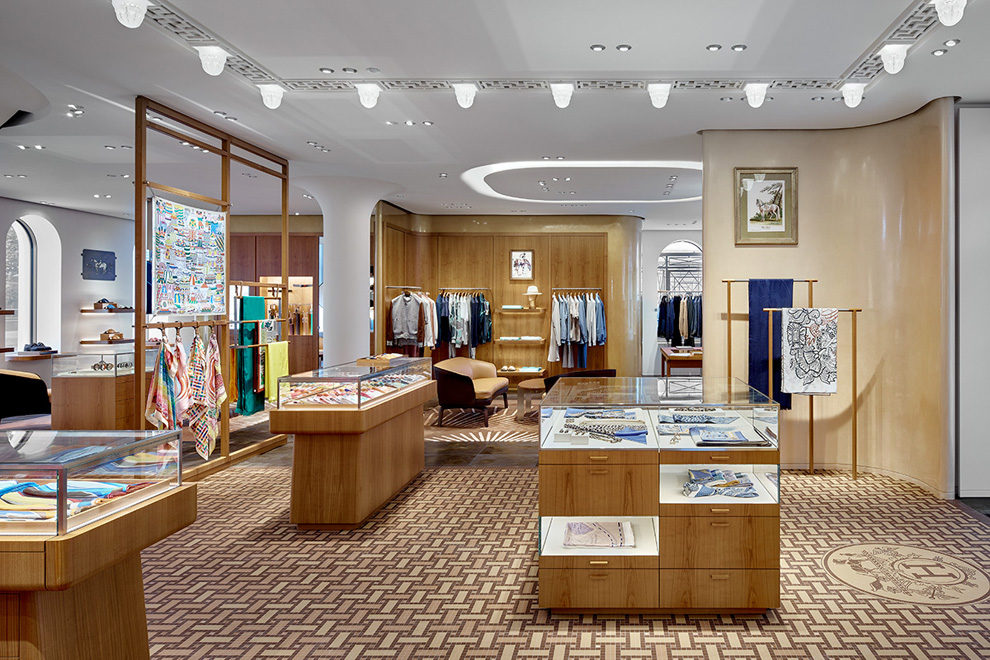 Помещение на первом этаже начинается с шелка: первый зал украшен легендарным мотивом Hermès Ex-Libris — точно как на полу в парижском бутике Дома на Фобур Сент-Оноре. В окружающих пространствах из вишневого дерева представлены кожаные аксессуары и мужские коллекции. На втором этаже находятся женские коллекции, в четырех открытых и приватных салонах.