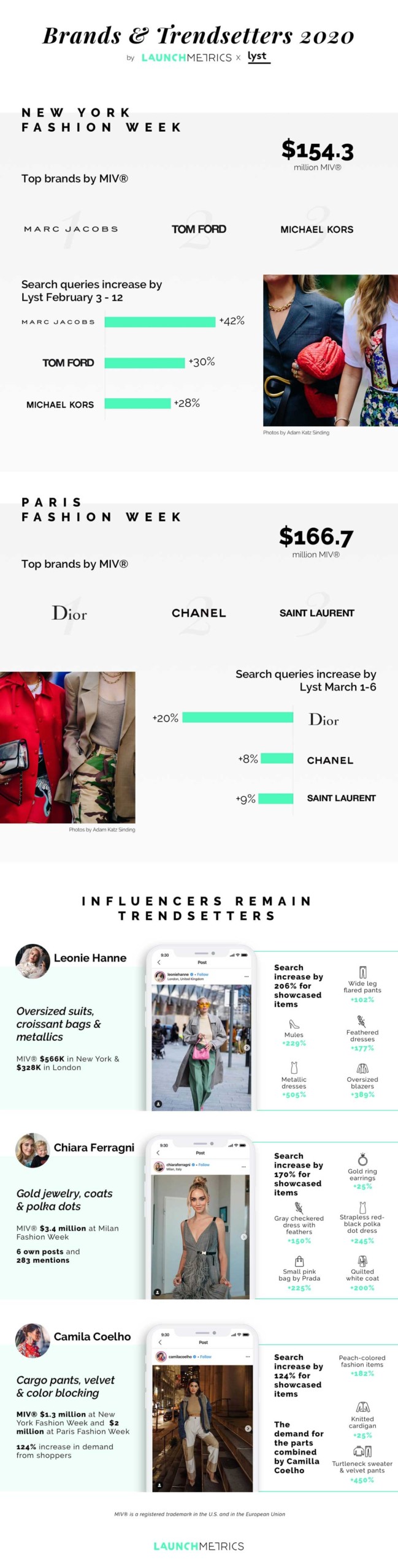 Media Impact Value Недель моды в Лондоне, Милане и Париже был также значительным. На парижскую Неделю моды пришлось 166,7 миллиона евро в кликах, лайках и покупках. Особенно много внимания было уделено Dior, Chanel и Saint-Laurent. Милан заработал 142,2 миллиона в стоимости медиа-воздействия; Лондон - 62,7 миллиона долларов.