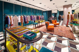 Интерьер нового пространства оформлен в новой дизайн-концепции Gucci в стилистике креативного директора дома Алессандро Микеле. По словам представителей итальянского бренда, в оформлении корнера сочетаются традиции и современность, индустриальный стиль и романтическая атмосфера. Стиль современной роскоши получил свое отражение в выборе характерных для Gucci материалов и в эргономичном использовании пространства как такового. Так, массивные поверхности и миниатюрные детали из металла сочетаются с креслами, выполненными из бархата и кожи, элементы из полихромного мрамора на полу создают эффект трехмерного узора, длинные встроенные зеркала визуально увеличивают пространство, а дисплеи для презентации товаров контрастируют с темно-изумрудными cтенами с мягкими вставками и восточными коврами красного цвета.