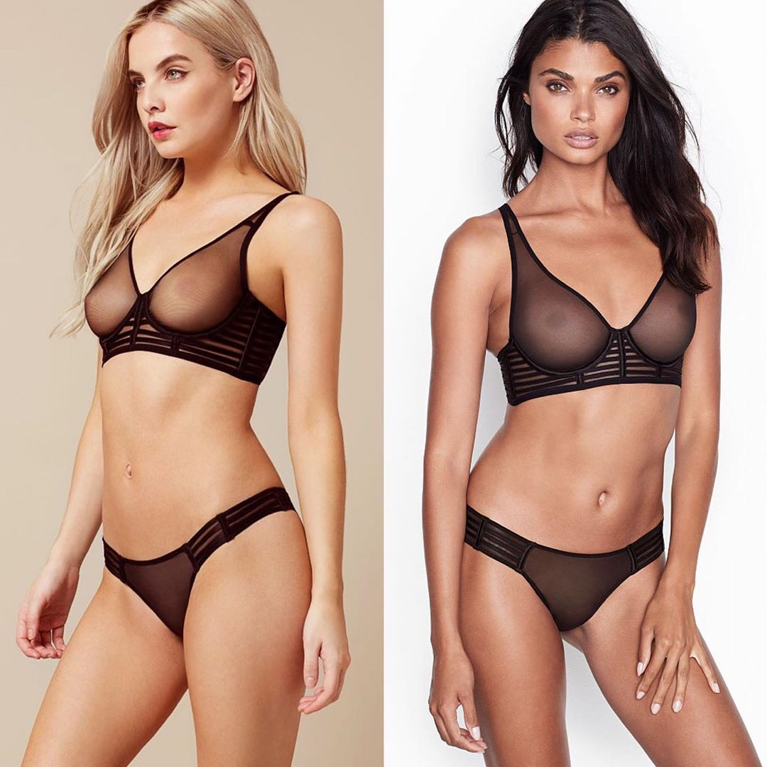 На странице Diet Prada появилось несколько коллажей, на которых представлены фотографии моделей в идентичных комплектах. Однако на девушке слева белье компании Agent Provocateur, а на девушке справа — Victoria’s Secret.